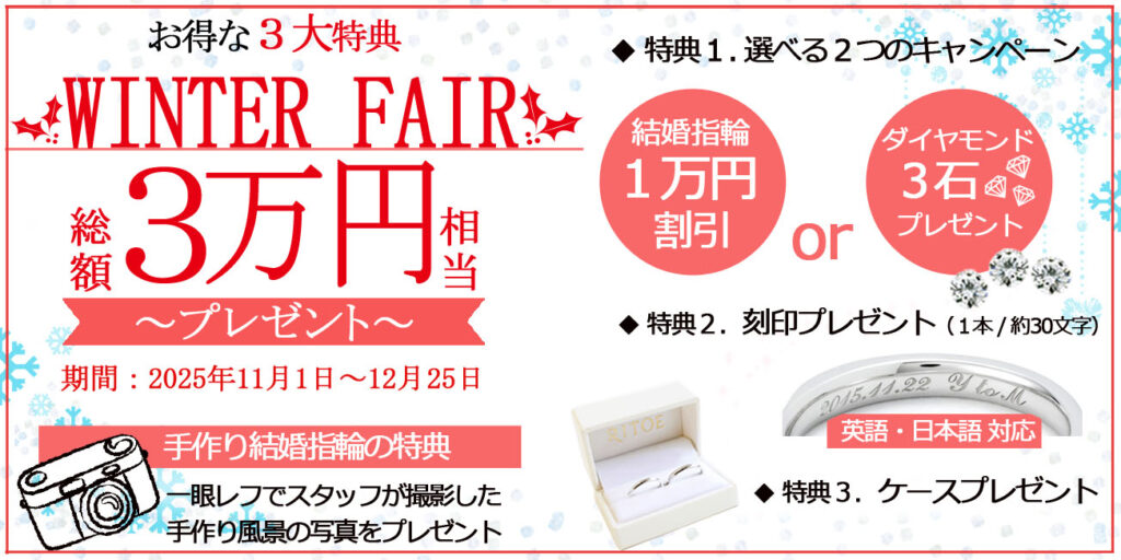 レーザー刻印と手打ち(打刻)の2種類から、お好みに合わせて文字入れいただけます。現在、指輪の内側に30文字までレーザー刻印を無料でプレゼントしています。